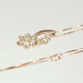 超可愛いお花形の枠に10石のダイヤを敷き詰めた憧れのスウィートテン仕様!カラット数はなんと0.3ct!ダイヤのほうもピンクゴールドと相性の良いシャンパン系のライトブラウンカラーのテリの強い天然ダイヤを使用!このカラット数になると存在感もバッチリ!胸元で天然ダイヤならではの輝きの存在感をご堪能ください!