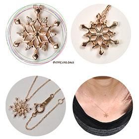 同じモノは一つとしてない雪の結晶、神秘的で儚くて……手のひらにのせると溶けて消えてゆくそんな世界をペンダントにしてあなたへ届けます。まるでダイヤモンドダストを想像させるように丁寧に作られた結晶の部分部分にメレダイヤをセットし、動く度に光が当たる度にキラキラと輝きます。ずっとあなたの元に止めておける奇跡の結晶……♪