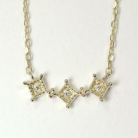 アンティーク調の四角形が3つ連結する枠それぞれにダイヤをセットしたシックなイエローゴールドのペンダントです!ネックレスチェーンもトップ脇に固定ですので、知らない間に引き輪が前に来てしまう心配もありません。