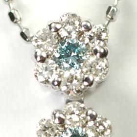 ミステリーフラワーセッティング(7石)を3つ連結した(合計21石で0.3ct)魅力的なペンダントで、各7石フラワーの中央にはブルーダイヤをセットさせていただいております。周りのホワイトダイヤも色味がなくテリのあるダイヤで、上品なジュエリーに仕上がっております。