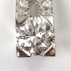 肉眼ではほぼ無色・無傷と言っていいクラスとされる、Hカラー以上、SIクラス以上で、カットはGOOD以上のダイヤモンド0.3ct以上の一粒ダイヤを主石としてセットし、枠上部とバチカンにも計0.1ct以上のダイヤをセットした豪華なペンダントです。ダイヤのスペックを保証する上で、ハードカバー付きの高級タイプの鑑定書をお付けさせて頂きます。プラチナを存分に使用し、脇石も含めて、非常に高級感があります。
