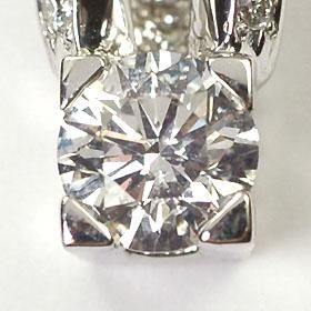 肉眼ではほぼ無色・無傷と言っていいクラスとされる、Hカラー以上、SIクラス以上で、カットはGOOD以上のダイヤモンド0.5ct以上の一粒ダイヤを主石としてセットし、枠上部に約0.07ct前後のメレダイヤをセットした豪華なペンダントです。ダイヤのスペックを保証する上で、ハードカバー付きの高級タイプの鑑定書をお付けさせて頂きます。プラチナを存分に使用し、脇石も含めて、非常に高級感があります。