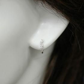 色味のないダイヤを前面に5石(合計10石で0.2ct)セットしたハーフタイプのエタニティーフープピアスです。前面にダイヤを集中させておりますので、前から見たボリュームは0.4ctのフルエタニティーと互角です。ジガネもプラチナを使用し、永くご愛用頂けるピアスに仕上がっております。