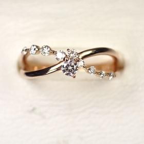 結婚10周年のギフトとしてお薦めのスウィートテンタイプのリングで、ピンクゴールドの女性らしさ・可愛さとデザイン性で高級デザインリングとしてもオススメです。使用する10石のダイヤはいずれもSIクラスのテリ(輝き)のある綺麗なダイヤを使用しており、カードタイプの鑑別書もお付けさせていただきますので、特別な贈り物に最適です。