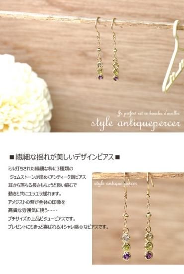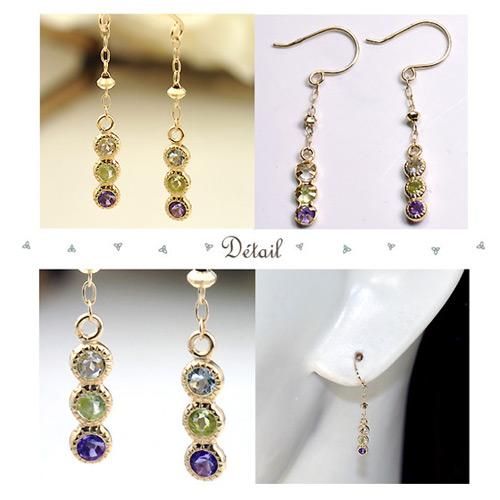 K10YG・アクアマリン&ペリドット&アメジスト ジェムスリーストーンフックピアス