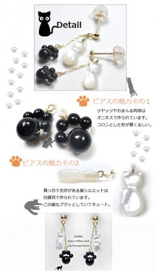 K10・オニキス&白蝶貝 愛くるしい猫シルエットと肉球デザインピアス