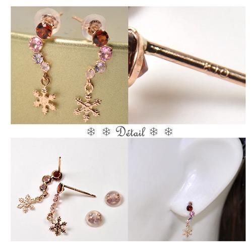 K10PG・ガーネット・ピンクトルマリン・アメジスト・ローズクオーツ 揺れるスノーフレークピアス