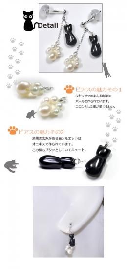 K10WG・オニキス&パール(真珠) 愛くるしい猫シルエットと肉球デザインピアス