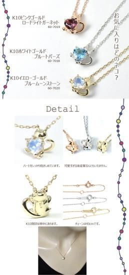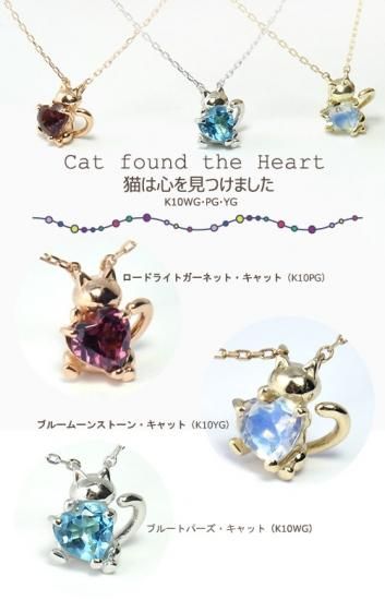 K10(YG・PG・WG)・ハートシェイプ天然石(ブルートパーズ・ロードライトガーネット・ブルームーンストーン) ネコ猫キャット&ハートペンダント(ネックレス)
