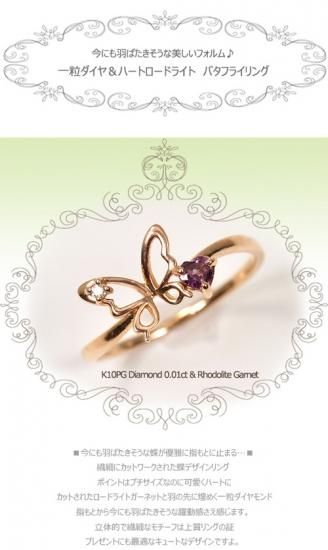 K10PG・ダイヤモンド0.01ct&ロードライトガーネット ジェムストーンハートカットバタフライリング