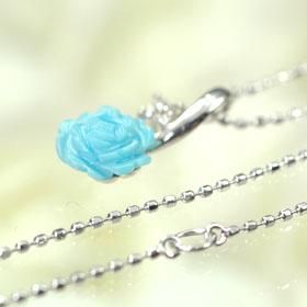 ローズの形にカットしたトルコ石(ターコイズ)と、フラワーデザインにセットしたダイヤ(形0.02ct)がぶら下がるペンダントは存在感抜群!こちらはチェーンもすべて国内生産で品質的にもご安心いただけます。