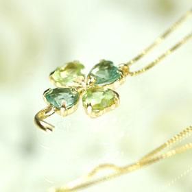 ハートシェイプカットのペリドット2石とグリーンクォーツ2石を、クローバーデザインのゴールドに交互に留めた、質感の高いクローバーペンダント。チェーンもベネチアンチェーンをあしらっておりますので、フォーマルにもアリかも!幸せを運ぶ四つ葉のクローバーは贈り物にも喜ばれます。