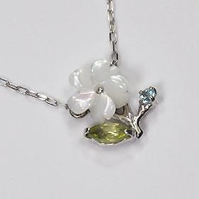 ホワイトシェルで象る上品なフラワーと、ペリドットとブルートパーズで枝葉を表現!凝った作りが魅力の天然石ジュエリーとなっております!