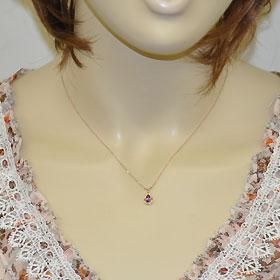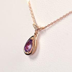 お手頃価格でありながら、本物ならではの風合い、作りが良く質感が高い素敵なネックレスシリーズです。デザインも可愛くて上品!普段着けはもちろん、親しい方への贈り物にも超オススメです!主石にはペアシェイプカットのアメジストを据え、バチカン部分にはダイヤモンドが1石輝きます。