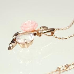 K10PG・ローズクォーツ&ピンクシェル&ダイヤ ローズペンダント(ネックレス)