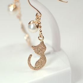 涙が出るほど可愛い仔猫のシルエットをデザインしたフックピアスで、ネコちゃんがぶら下がって揺れるのと、木の実のような淡水パールもぶら下がる贅沢仕様で、ネコちゃんのプレートも表はツルツル、裏はザラザラとつや消し加工という凝った作りです。