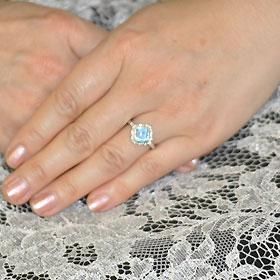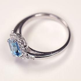 大粒の半貴をあしらった贅沢ジュエリー!クラシカルな透かしの枠の中央に、プリンセスカットのブルートパーズを据え、両脇にはダイヤモンドを1石ずつ配した、まさに宝石感いっぱいの逸品リングです。