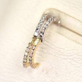 また、ゴールドとホワイトゴールドのリバーシブル仕様となっており、前から見るとゴールド、後ろから見るとホワイト、またはその逆という風に、気分を変えてご使用いただくことが可能です。そしてこちらは全周にダイヤモンドを敷き詰めたフルエタニティー仕様となっており、天然ダイヤならではの輝きが耳元をゴージャスに演出してくれる逸品です。