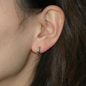 ホワイトゴールド単色のシンプルな商品で、着用して見た感じは、まるでフープピアスや中折れピアスを着けているように見えます。