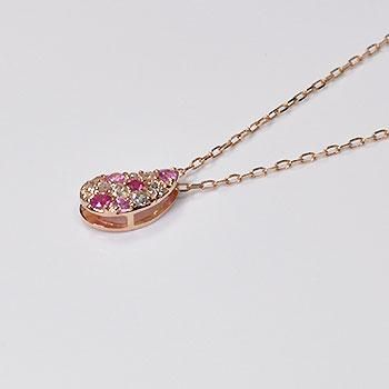 ホワイトサファイア、ピンクサファイアとグラデーションのごとく雫形の枠に敷き詰めた、贅沢でフェミニン&ロマンティックなネックレスです。