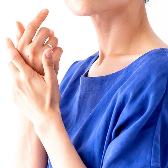 約4mm前後のウェーブデザインのプラチナのリングはシンプルでありながら、センターが平面打ちされており、ほどよい存在感とボリュームで凛とした印象の手元に。裏抜きなしのボリューミーな地金のリングは、本物ならではの重厚感と上品な輝きを放ちます。