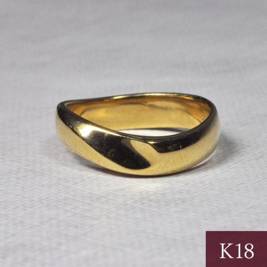 約4mm前後のひねりが入ったウェーブデザインの18金のリングはシンプルでありながら、重量感たっぷりで、見た目にもまさに高価な貴金属の存在感があります。裏抜きなしのボリューミーな地金のリングは、本物ならではの重厚感と上品な輝きを放ちます。