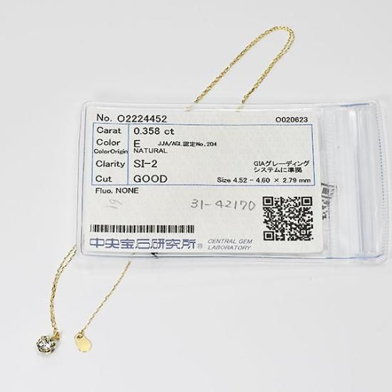 K18・ダイヤモンド0.358ct(Eカラー・SI2・GOOD・中央宝石研究所鑑定ソーティング) ソリティアネックレス
